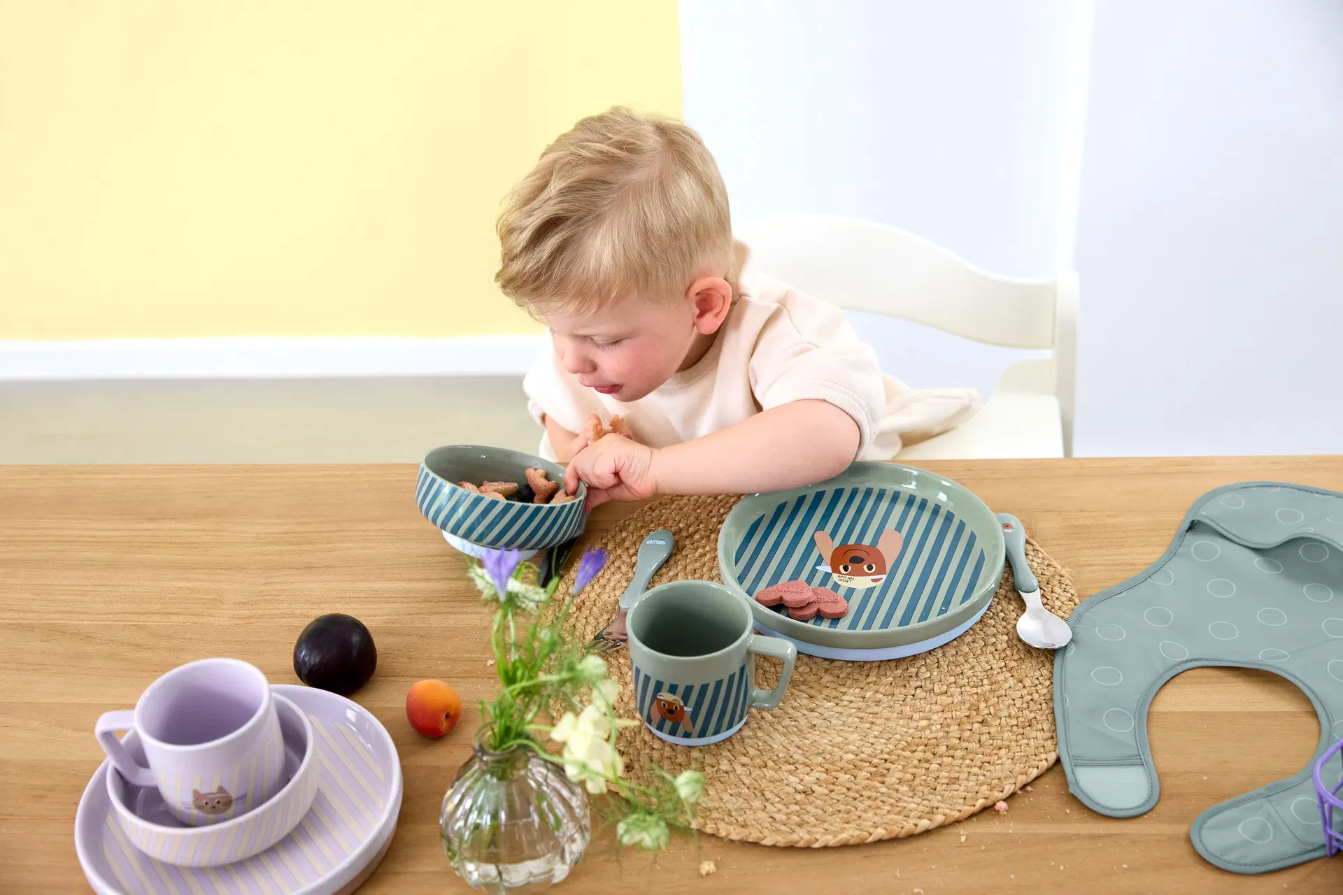 Das Set besteht aus einem Teller, einer Schüssel und einem Becher – perfekt für kleine Portionen. Jedes Teil hat einen abnehmbaren, rutschfesten Silikonring am Boden, der für Stabilität auf dem Tisch sorgt und so das Verschütten beim selbstständigen Essenlernen reduziert.