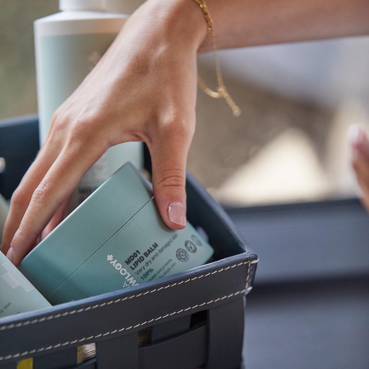 For extremely dry hands or hand eczema: Apply MD01 Lipid Balm to your hands before going to bed and leave on overnight – preferably wearing cotton gloves.