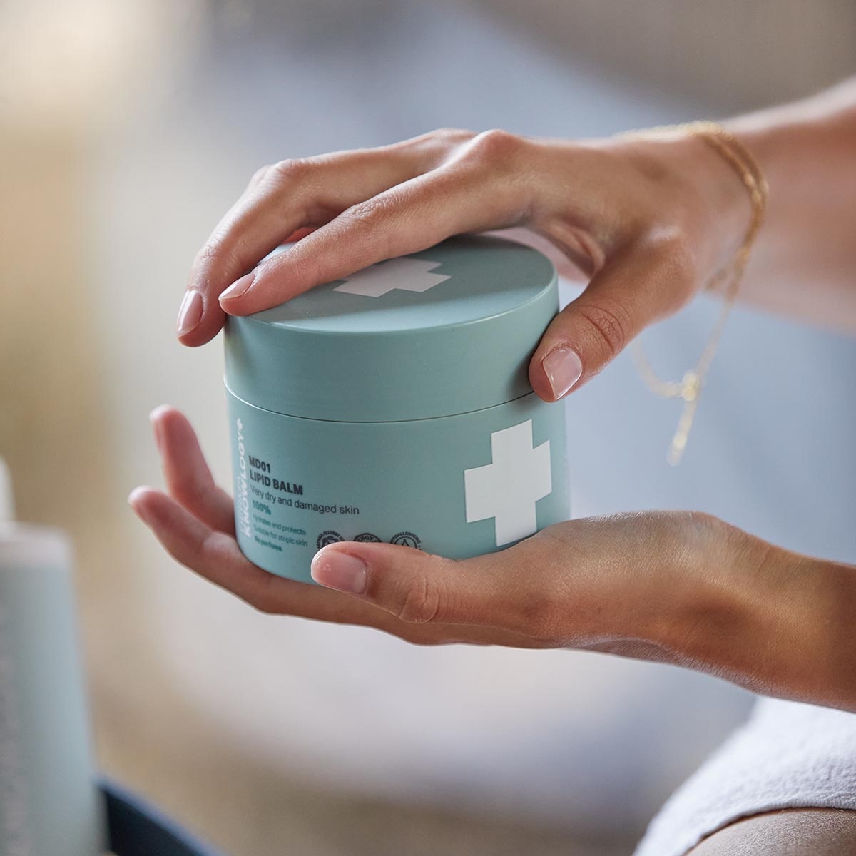 MD01 Lipid Balm is a rich, water-free ointment that forms a protective barrier and effectively reduces moisture loss. Suitable for very dry, damaged, and atopic skin prone to eczema, it can also be used as a cold cream for skin exposed to cold and wind. The balm can also be used preventatively to combat skin friction and chafing, for example, during exercise. Developed by a Danish dermatologist – made in Denmark.