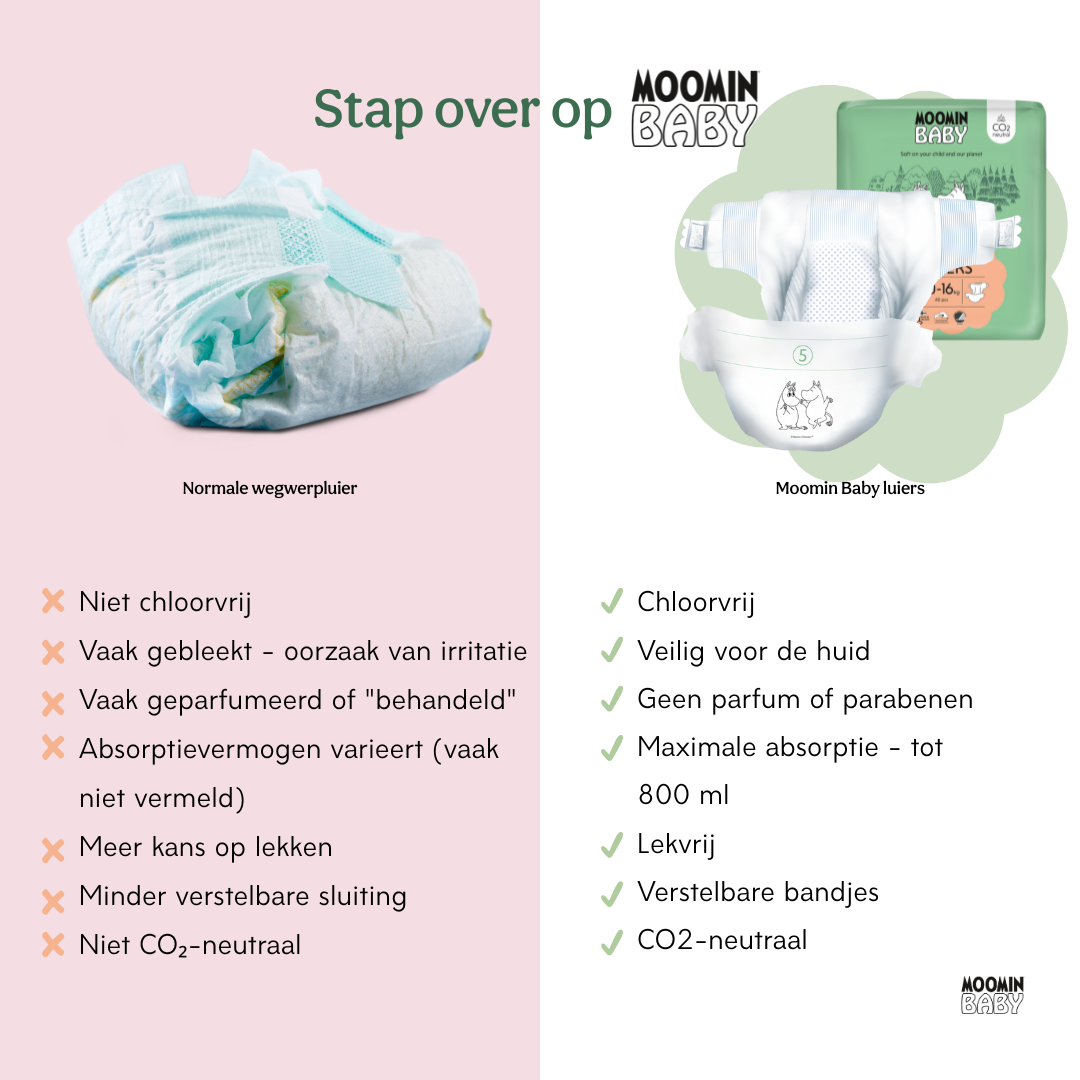 Choose the right size based on your child's weight. Moomin baby diapers and pants are certified with the Nordic Swan Ecolabel. They were developed in collaboration with the Finnish Allergy and Asthma Federation and are dermatologically tested. Moomin baby diapers are free of perfume, lotion, latex, formaldehyde, and phthalates!