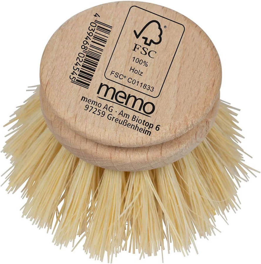 La brosse de remplacement est fabriquée en bois de hêtre non traité et dotée de fibres végétaliennes (fibres végétales dures). Son diamètre est d'environ 5 cm, parfait pour atteindre tous les recoins de votre vaisselle.