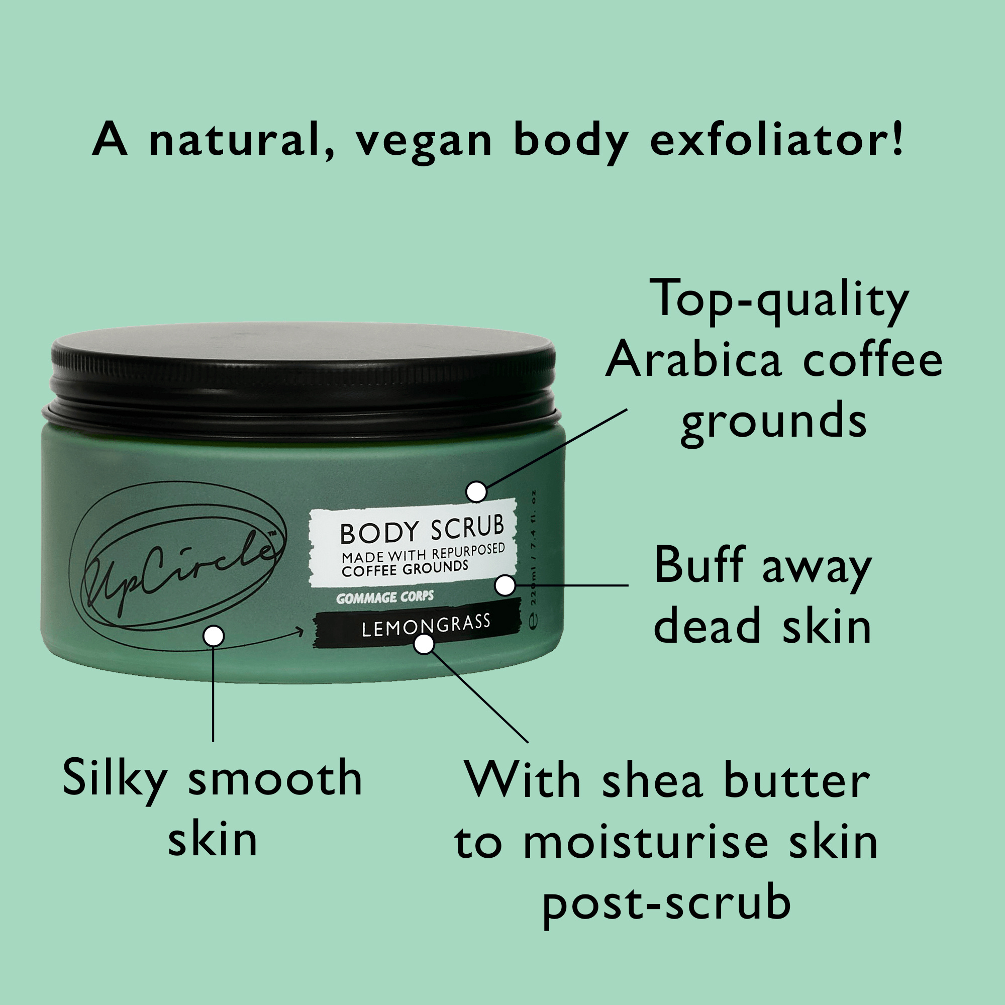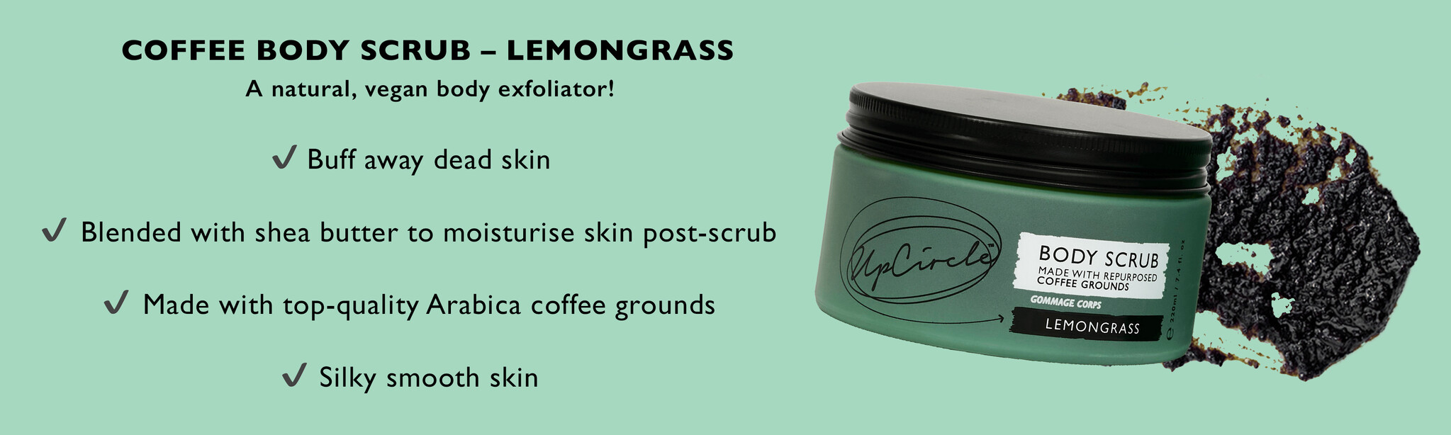 Le gommage corporel UpCircle est un gommage naturel et végan fait à partir de citronnelle et de café, enrichi en sel marin, citron vert et huile de coco. Ce gommage exfolie la peau en prenant soin d'éliminer les cellules mortes, laissant votre épiderme doux et soyeux.