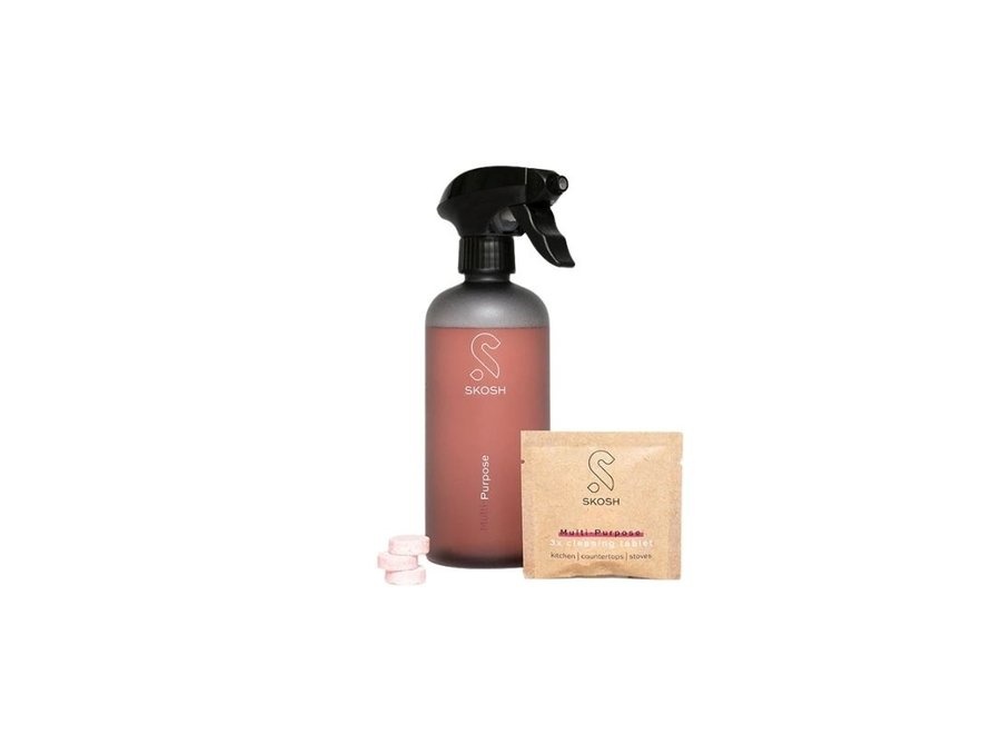 Maak je huis blinkend schoon met de herbruikbare fles inclusief 1 tablet allesreiniger. Het tablet is genoeg om 500 ml allesreiniger te maken. Natuurlijk zonder schadelijke chemicaliën en plastic afval, want je kan de fles hergebruiken de volgende keer! Met de navulling tabs maak je snel en makkelijk een nieuwe batch. SKOSH heeft verschillende soorten schoonmaak tabletten voor verschillende poets doeleinden.
