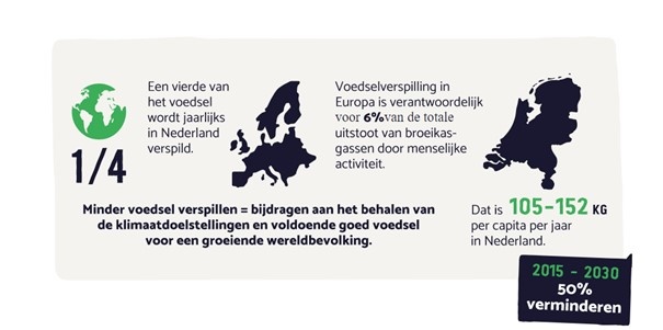Wist je dat in Nederland een kwart van al het voedsel verspild wordt? Hiermee draagt voedsel, dat niet eens wordt gegeten voor 6% bij aan de totale Europese CO2-uitstoot. In Nederland gooien we per persoon gemiddeld 105 tot 152 kilogram eten per jaar weg, wat natuurlijke hartstikke zonde is. Tijdens de verspillingsvrije week doen we ons best om dit te verminderen. Het doel is om in 2030 de voedselverspilling als één van de eerste landen in Europa gehalveerd te hebben. Zo verhogen we de kans om onze klimaatdoelen te halen, en blijft er ook meer goed voedsel over voor de groeiende wereldbevolking. In deze blog lees je wat jij kunt doen om verspilling tegen te gaan.