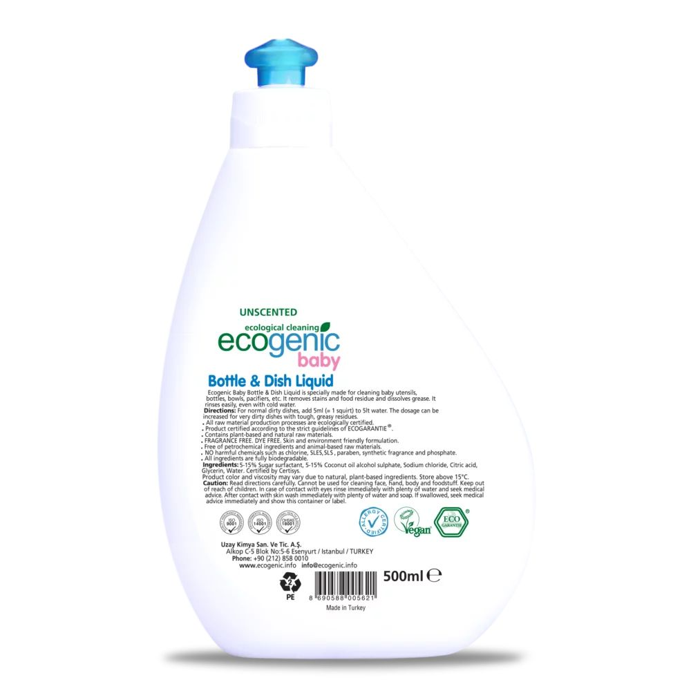 Het Ecogenic Baby Afwasmiddel is een ongeparfumeerd, plantaardig en volledig biologisch afbreekbaar afwasmiddel, speciaal ontwikkeld voor babyflessen, kommetjes, spenen en ander babyservies. Het verwijdert effectief voedselresten, vet en vlekken, zelfs met koud water, zonder agressieve chemicaliën.