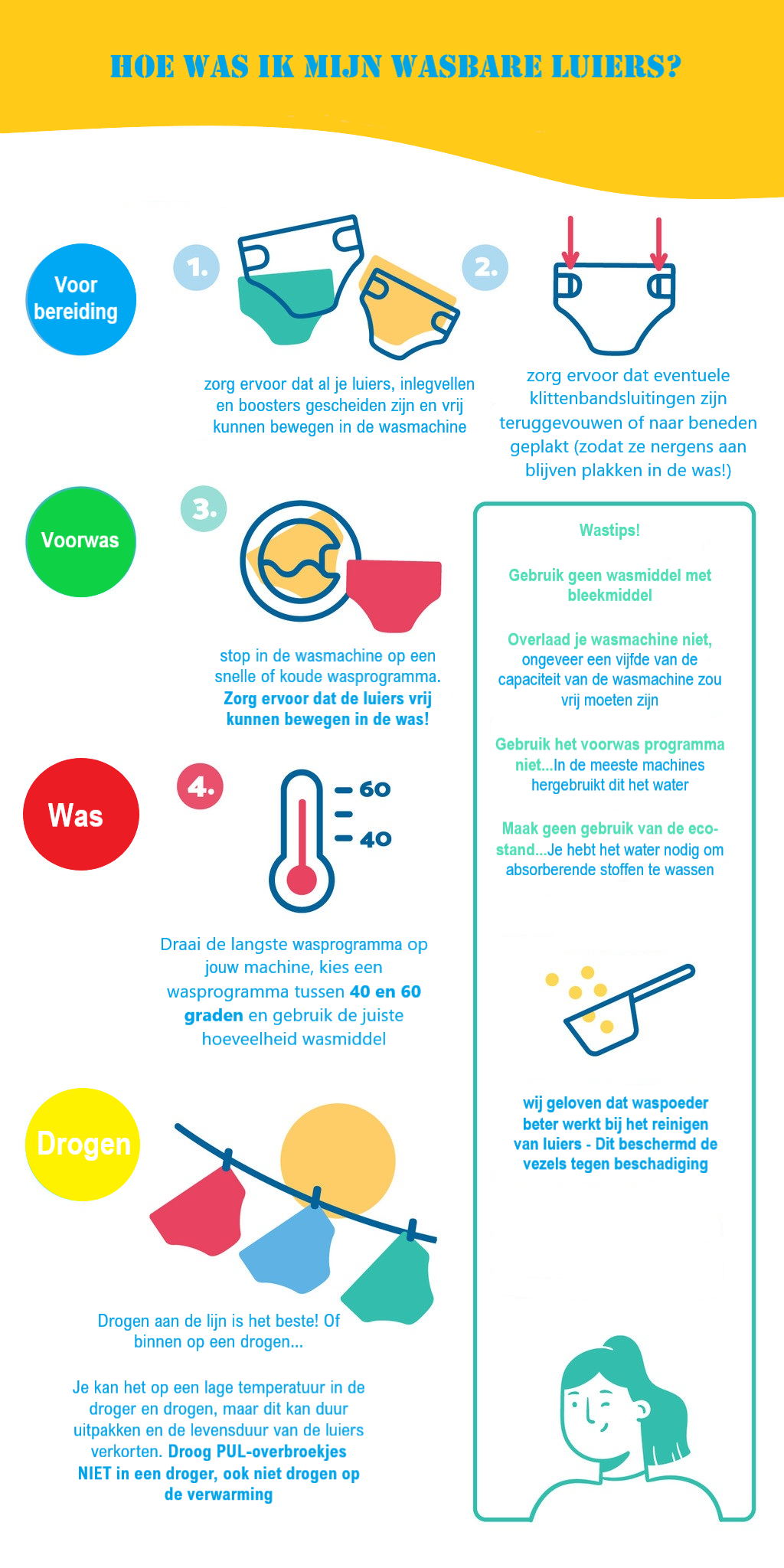 We raden aan om een inweek en wasemmer te gebruiken om je luiers te spoelen en te zeven voordat je ze in de wasmachine stopt. Dit kan gewoon met water. Je kunt een koude spoelcyclus doen of snel wassen in je wasmachine zonder gebruik van wasmiddel, agressieve vlekken verwijderaar of bleekmiddel, omdat dit de vezels in de luier kan beschadigen.